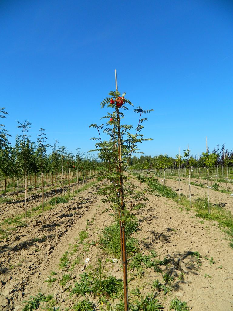Внимание! Ниже указана цена на поставку посадочного материалаРябина обыкновенная - листопадное дерево семейства розоцветных (Rosaceae), высотой до 20 м (в основном 4-6 м), реже кустарник с поверхностной корневой системой. Кора серая, гладкая, молодые ветви пушистые. Листья очередные, непарноперистые, продолговатые или продолговато-ланцетные. Молодые листья снизу опушенные, поздние голые. Цветки белые или розоватые с неприятным запахом (запах триметиламина, напоминающего запах конского навоза), собраны в густое щитковидное соцветие - метелку, диаметром до 10 см. Плоды - шаровидные, яблокообразные, ярко-красные или оранжево-красные, сочные. Семена красноватые, серповидно изогнутые, острые на конце. Цветет в мае - июне, плоды созревают в сентябре - октябре и обычно остаются на деревьях до глубокой зимы. Плодоносит рябина обыкновенная с 5-7-летнего возраста ежегодно. Хороший урожай рябины обычно наблюдается раз в 1-3 года, наибольший урожай дает с 35-40 лет. Одно дерево может дать до 80-100 кг плодов. Размножается семенами и корневыми отпрысками. Живет до 200 лет. Распространена рябина на всей территории европейской части СНГ, на Кавказе, Дальнем Востоке, Камчатке, в Сибири, Приамурье, горах Казахстана и Кыргызстана. Растет по берегам рек, озер, на полях, вдоль дорог, в подлеске хвойных и смешанных лесов, по лесным опушкам, высаживают ее в скверах, парках, садах.